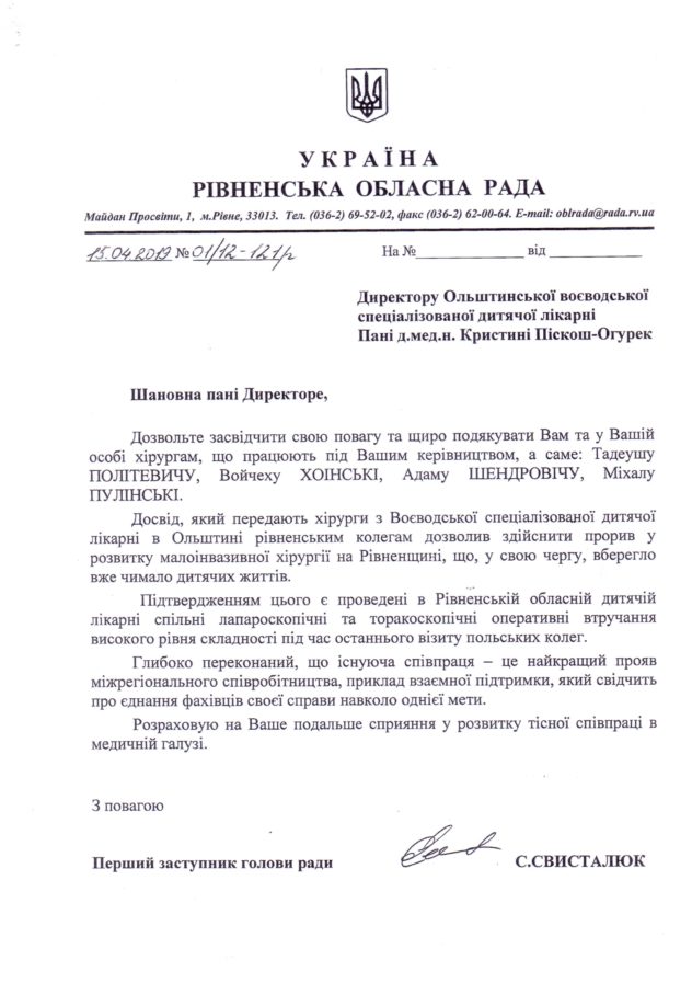 W dniach 6-12 kwietnia delegacja naszych chirurgów przebywała z wizytą szkoleniową w Równem na Ukrainie. Nasi specjaliści przeprowadzili w tym czasie wraz ze swoimi kolegami z Ukrainy szereg operacji, szkoląc przy okazji lekarzy z Równieńskiego Obwodowego Szpitala Dziecięcego w stosowaniu małoinwazyjnych technik laparoskopowych. Warto zaznaczyć, że ta współpraca trwa już 3 lata. Z tej okazji na ręce dr Krystyny Piskorz-Ogórek, dyrektor Wojewódzkiego Specjalistycznego Szpitala Dziecięcego w Olsztynie, Rówieńska Rada Obwodowa przysłała specjalne podziękowanie, którego tłumaczenie zamieszczamy poniżej: