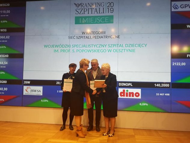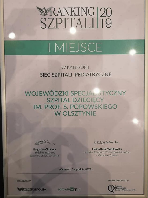 Pierwsze miejsce wśród szpitali pediatrycznych w prestiżowym ogólnopolskim rankingu Dziennika „Rzeczpospolita” i Centrum Monitorowania Jakości w Ochronie Zdrowia „Bezpieczny Szpital 2019” zajął Wojewódzki Specjalistyczny Szpital Dziecięcy w Olsztynie.