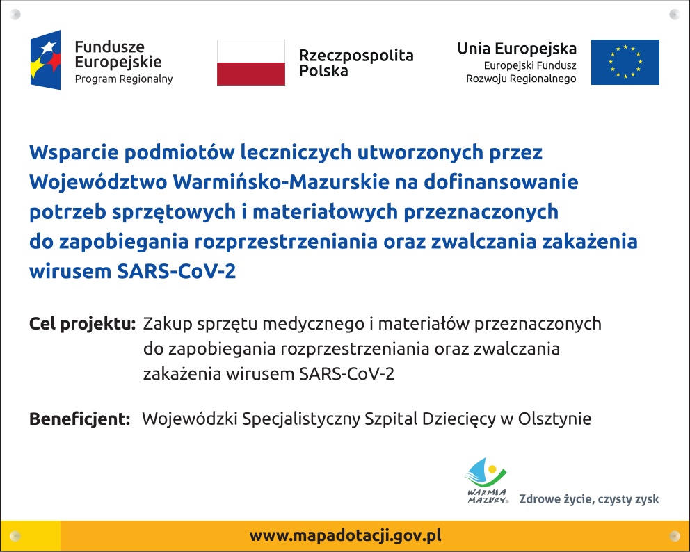 „Wsparcie podmiotów leczniczych utworzonych przez Województwo Warmińsko-Mazurskie na dofinansowanie potrzeb sprzętowych i materiałowych przeznaczonych do zapobiegania rozprzestrzeniania oraz zwalczania zakażenia wirusem SARS-CoV-2”
