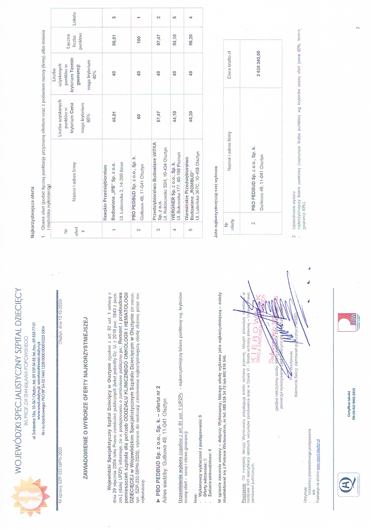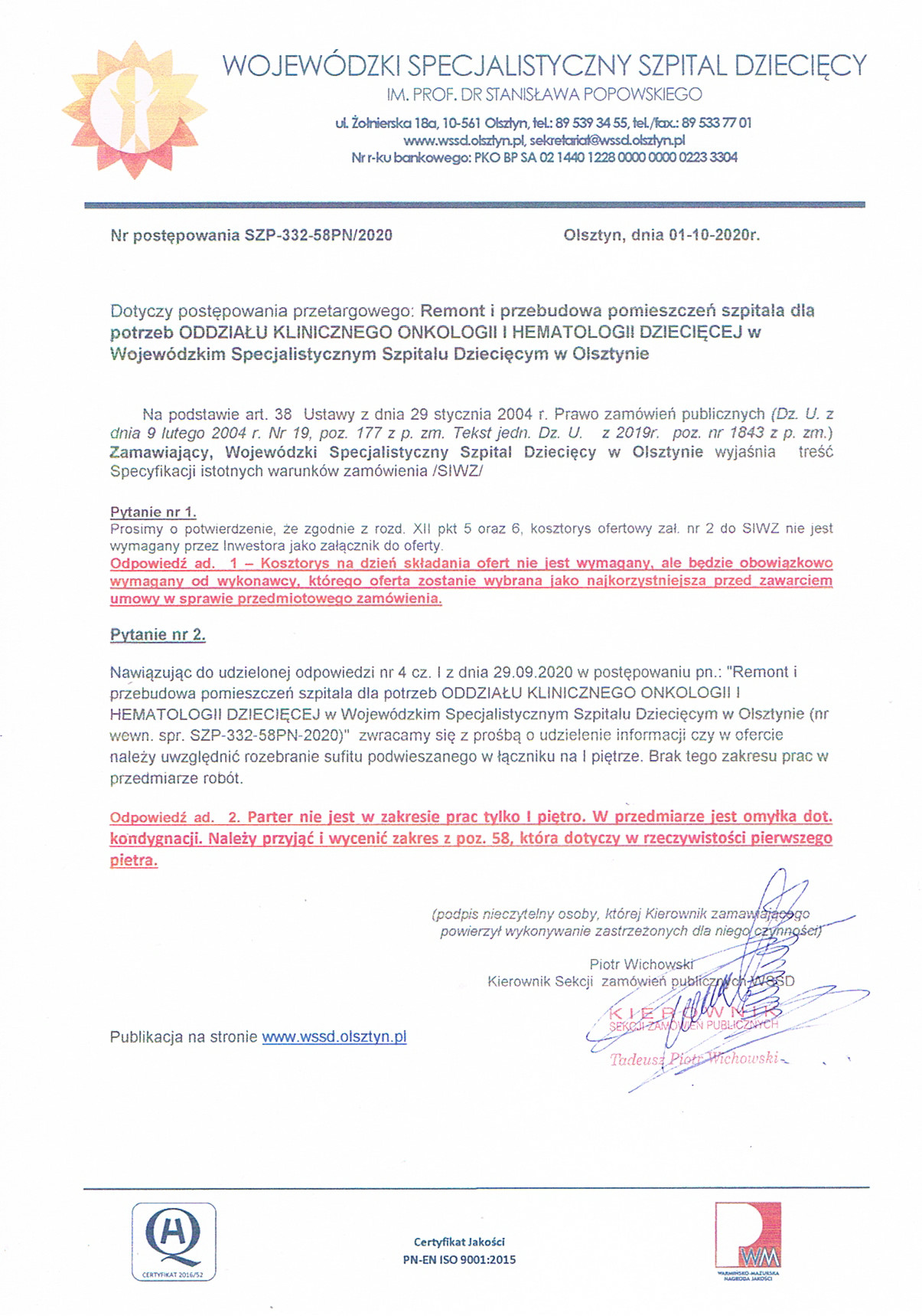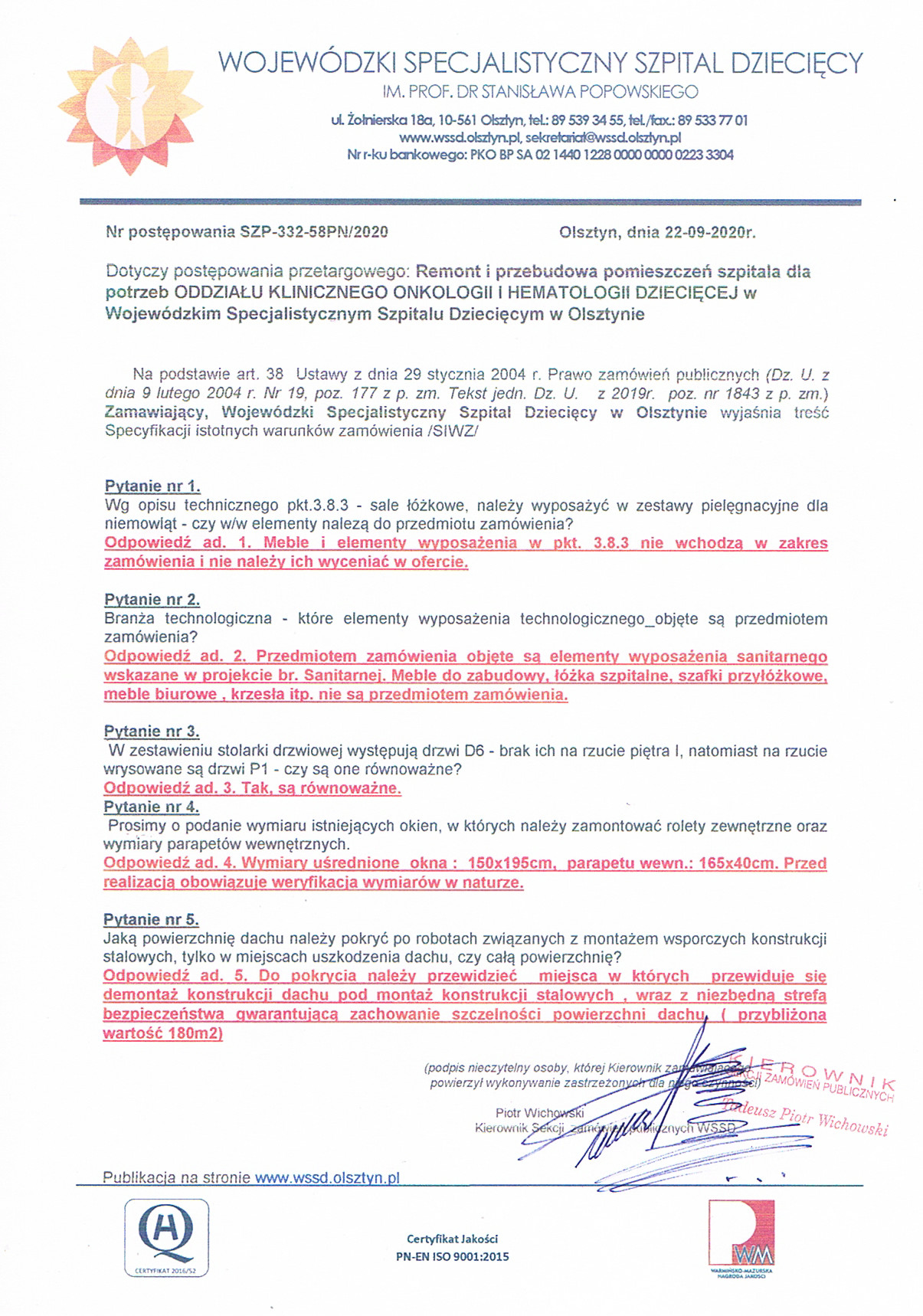 Remont i przebudowa pomieszczeń szpitala dla potrzeb ODDZIAŁU KLINICZNEGO ONKOLOGII I HEMATOLOGII DZIECIĘCEJ w Wojewódzkim Specjalistycznym Szpitalu Dziecięcym w Olsztynie (nr wewn. spr. SZP-332-58PN-2020)