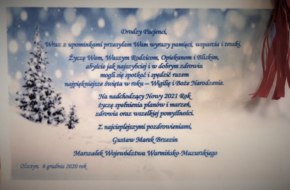 Ogromną radość sprawił dziś (4.12) naszym Pacjentom Pan Marszałek Województwa Gustaw Marek Brzezin, który – jak co roku – przygotował im piękne prezenty, wybrane indywidualnie dla każdego dziecka