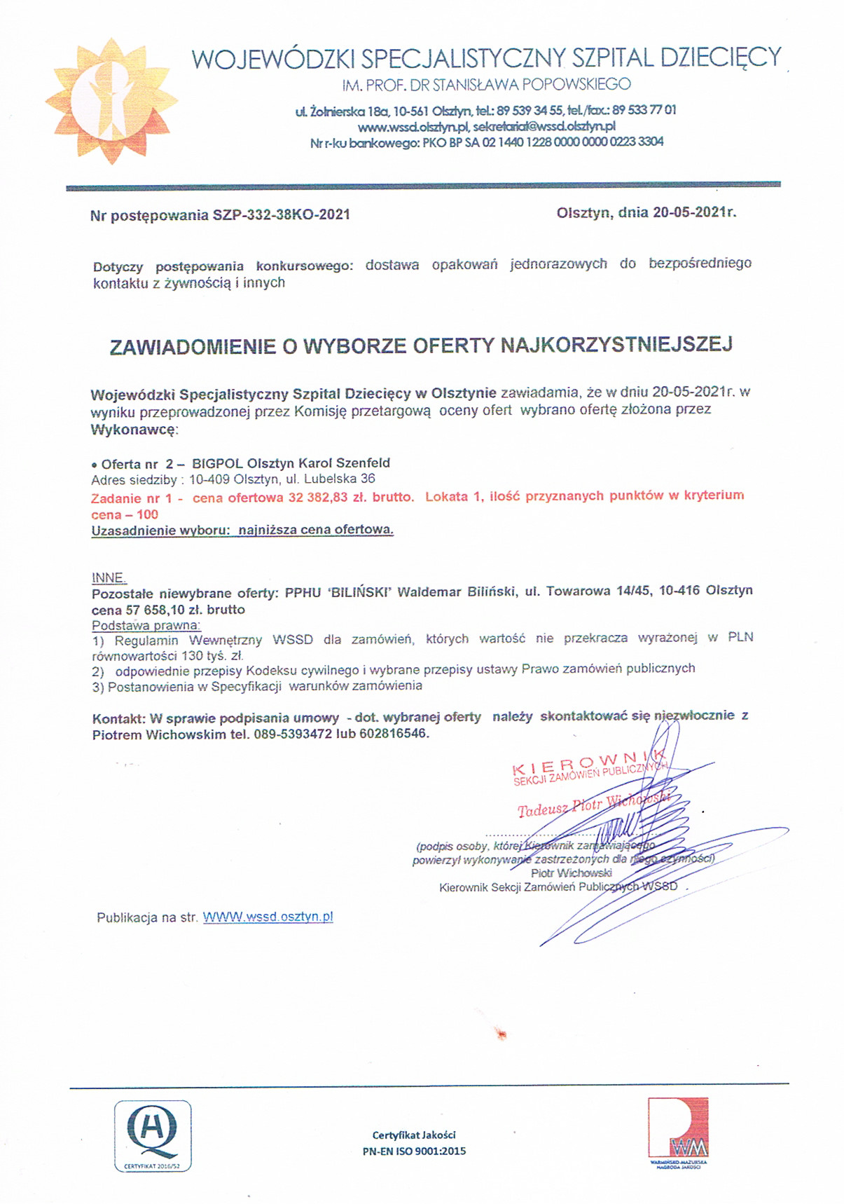 Opakowania jednorazowe do bezpośredniego kontaktu z żywnością i inne (nr wewn. spr. SZP-332-38KO-2021)